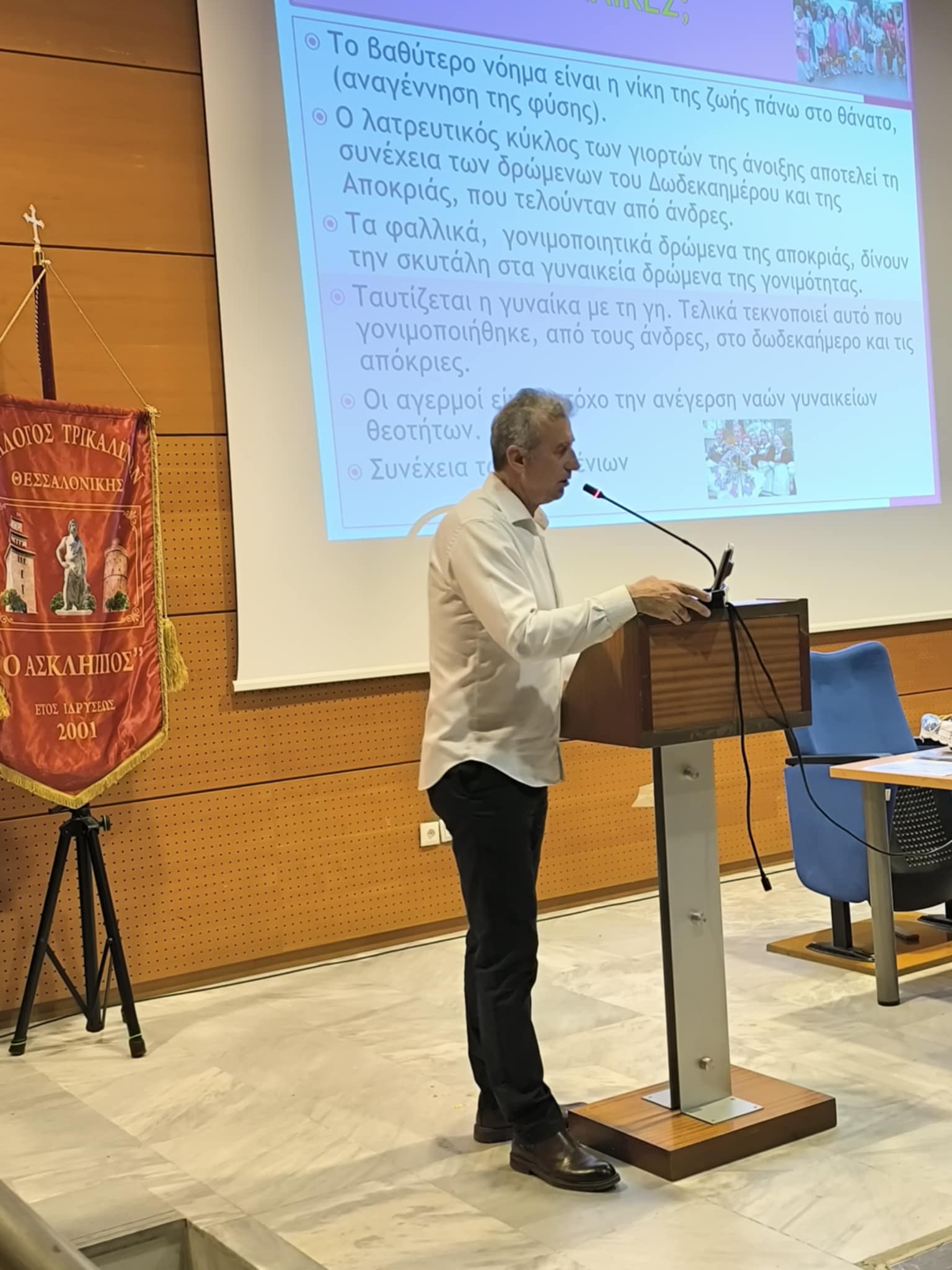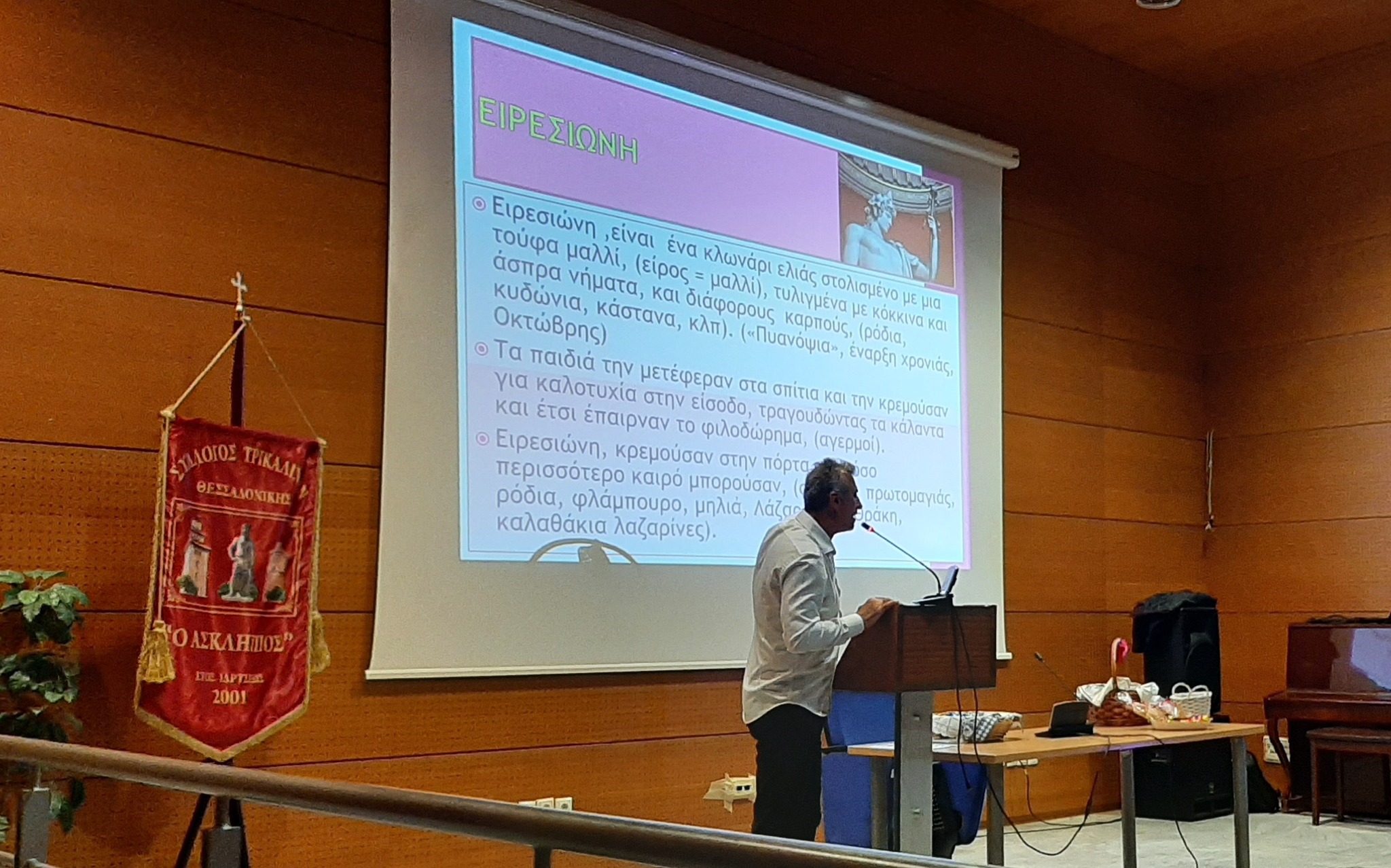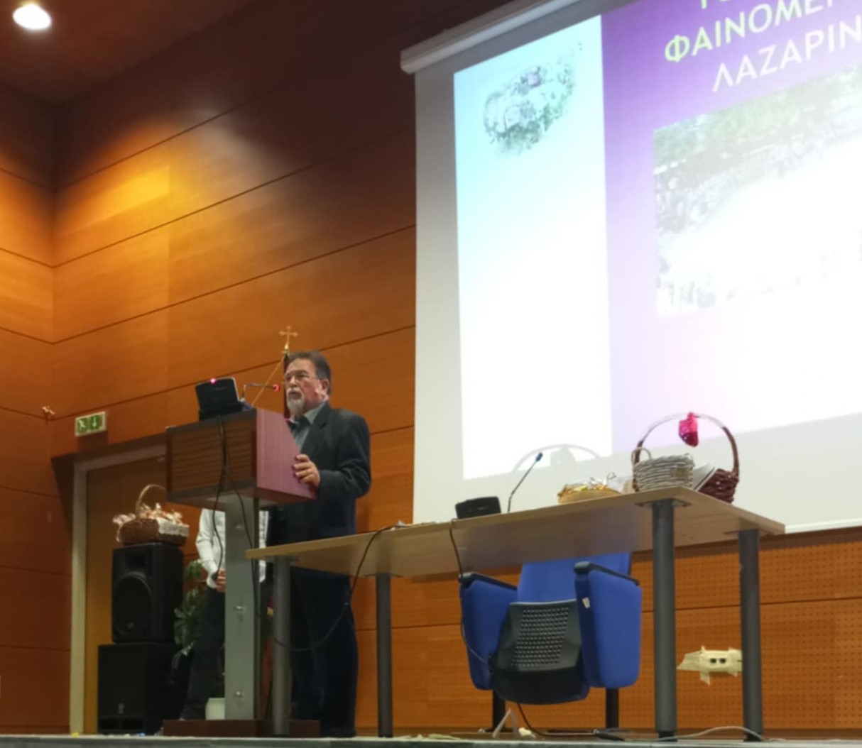 Ο καθηγητής κος Σκρέκας, ανέλαβε τη συνέχεια της εκδήλωσης, όπου μέσα από μία οπτική αναφορά, έδωσε την αρχή του φαινομένου των «Λαζαρίνων» όπως από την αρχαιότητα μεταλλάχτηκε κατά την περίοδο του Χριστιανισμού και πώς επηρεάστηκε από Δυτικές παρεμβάσεις.