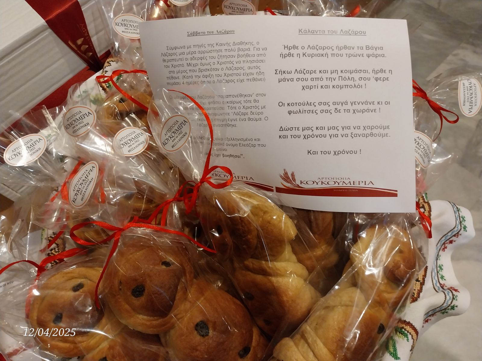 Σε όλους κι όλες που παραβρέθηκαν προσφέρθηκαν Λαζαροκούλουρα, ευγενής προσφορά της «Αρτοποιίας ΚΟΥΚΟΥΜΕΡΙΑ» μαζί με ένα φυλλάδιο με πληροφορίες για το έθιμο του Λαζάρου και γνωστό Λαζαροτράγουδο !!